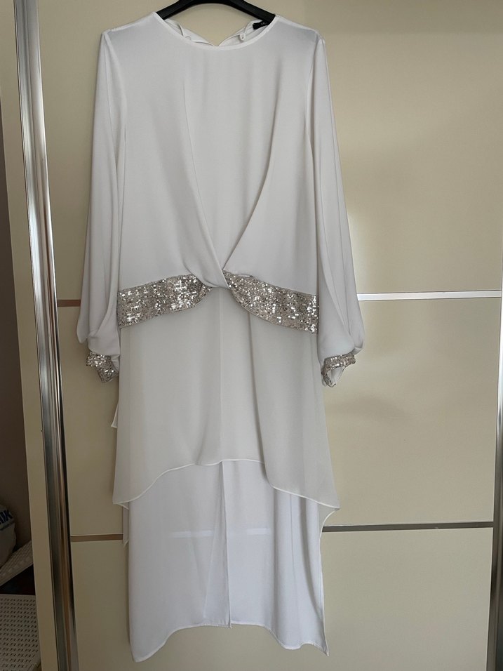Uzun kollu, drapeli beyaz elbise;bel ve kol manşetlerinde payet detayları bulunan, sentetik kumaştan, üst beden 42 alt beden 40, üst hukka marka alt senna ikili güzel bir kombin