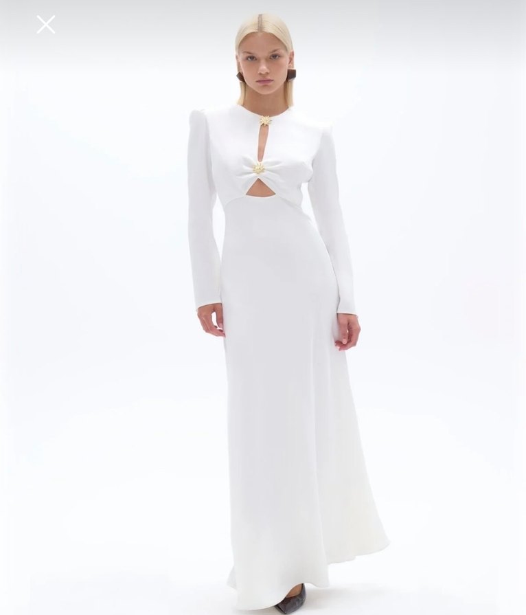 Uzun kollu, V yaka beyaz elbise, drapeli detaylı ve ince kesimlidir. İpek gibi dokusuyla düğün için uygundur. Minimalist, modern klasik tarzda.