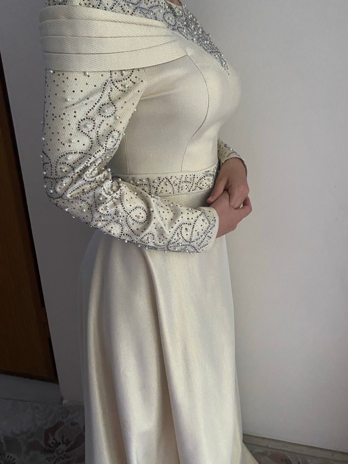 Uzun kollu, drapeli ve straplez kesime sahip bu beyaz nişan elbisesi, modern klasik ve vintage tarzı yansıtıyor. Parlak dokusu ve vücuda oturan kesimi ile öne çıkar. ✨