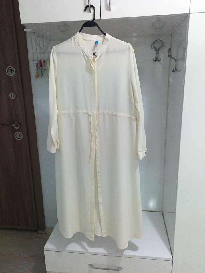 Uzun boy, uzun kollu beyaz gömlek, düğmeli ön ve yuvarlak yaka ile minimalist sokak stili için uygun, rahat ve hafif kumaş 1kere giyinildi bel ipten buzulebilir kalıp geniştir.