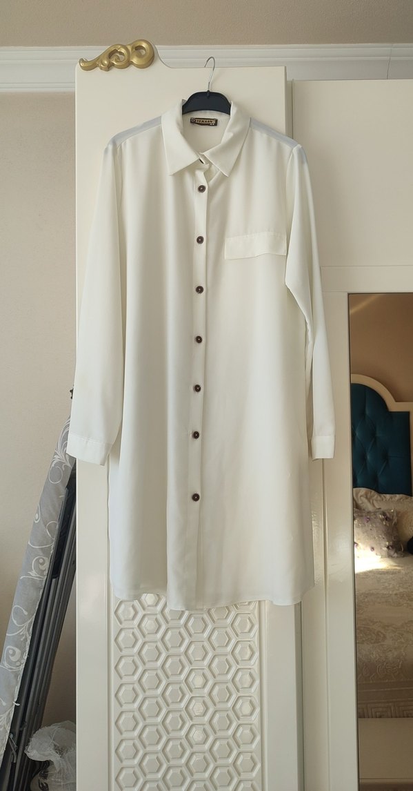Kadınlar için uzun boylu, düğmeli ve bol kesim beyaz gömlek. İpeksi dokusu, uzun kolları ve yakalı tasarımıyla günlük sokak stiline uygundur.