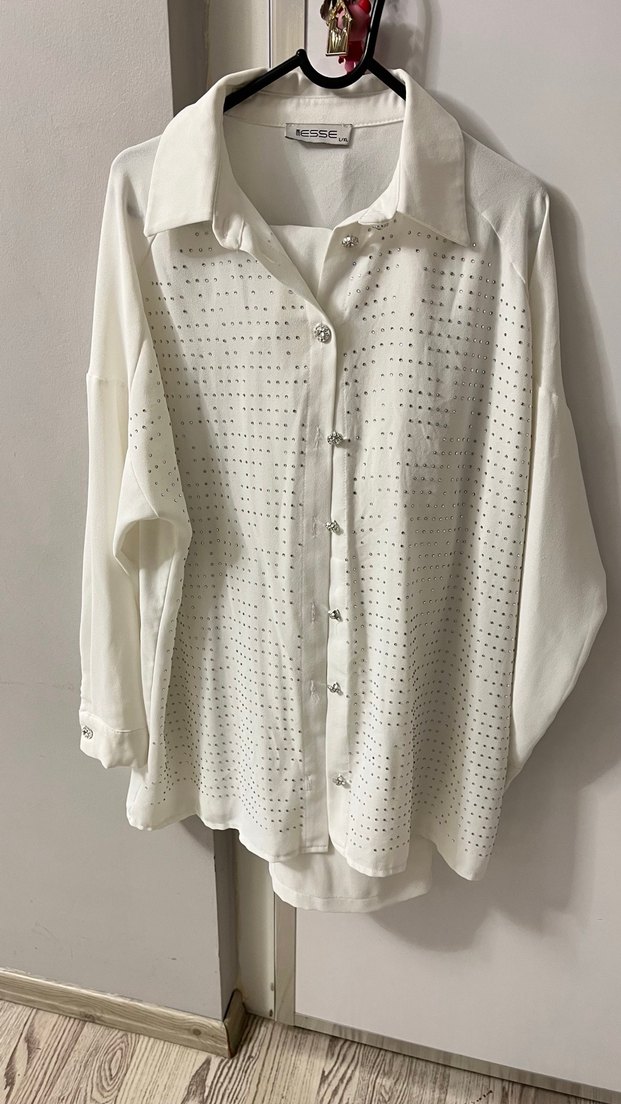 Uzun kollu, keten kumaştan beyaz gömlek. Düğmeli ve kesik yaka detaylı, bol ve uzun kesime sahip. Minimalist ve parlak görünüm sunar. ☀️