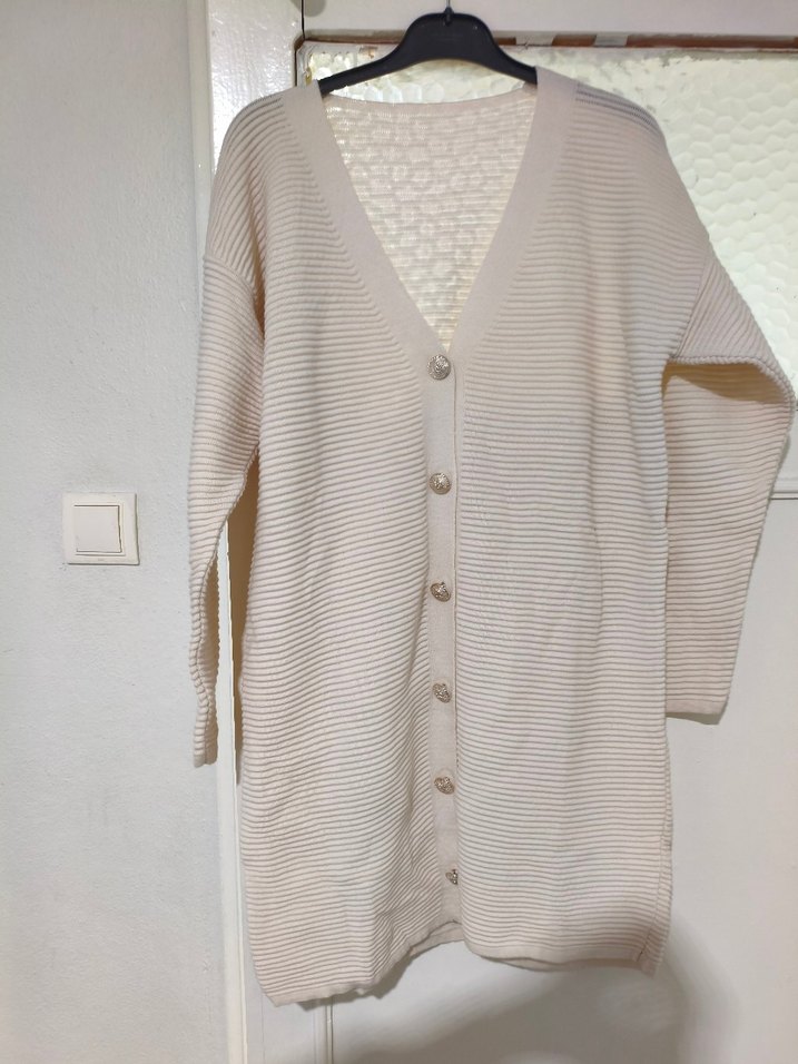 Yumuşak triko kumaştan uzun, bol kesim beyaz hırka, V yaka ve düğmeli kapama özelliğine sahiptir. Rahat ve günlük kullanıma uygundur.