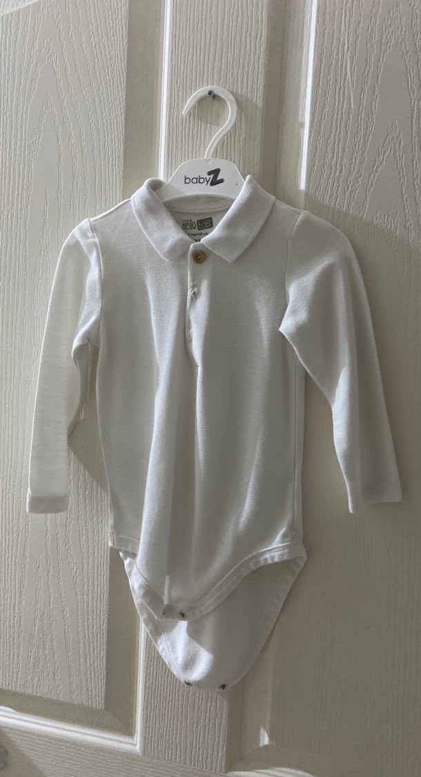 Uzun kollu, yakalı ve düğmeli beyaz bebek body. Düz ve yumuşak kumaştan üretilmiştir. Marka babyZ.