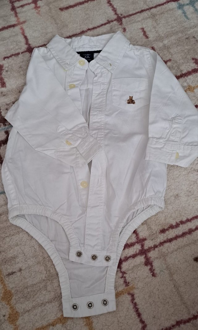 Uzun kollu, düğmeli ve kesimli yakalı beyaz erkek bebek body. Yumuşak pamuktan, küçük nakış detaylı, sokak stili. baby gap marka sorunsuz