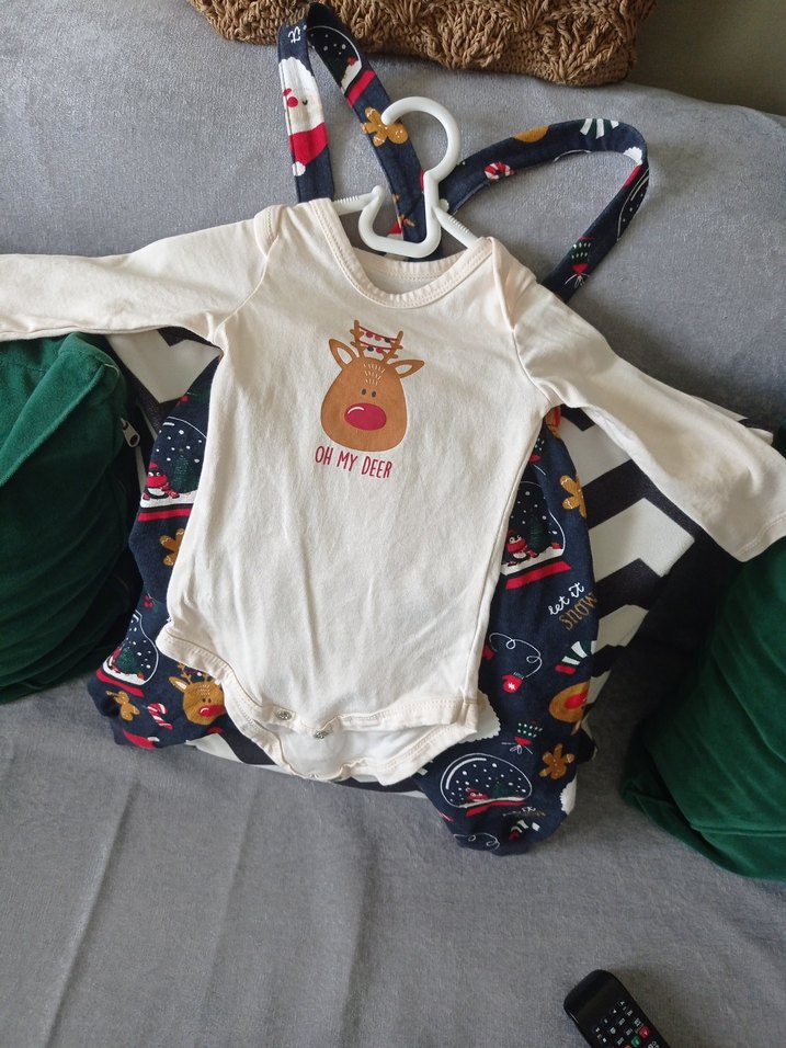 Uzun kollu, yuvarlak yakalı beyaz tulum, üzerinde geyik baskısı vardır. Tokalı askılar ve yumuşak, sıcak kumaştan üretilmiştir. yıkadım giydirmedim 3-9 ay arası uygunur