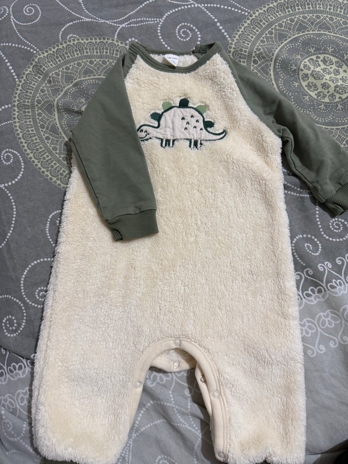 Uzun kollu, yuvarlak yakalı, yumuşak ve sıcak dokulu erkek bebek tulumu. Önde sevimli dinozor işleme detayı bulunur. Hiç giyilmedi