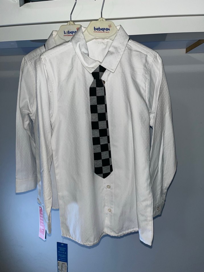 Uzun kollu beyaz erkek çocuğu gömlek, yaka kısmı çentikli ve düğmeli. Gri kareli kravat ile birlikte, sokak tarzına uygun bağlama deseni içerir.