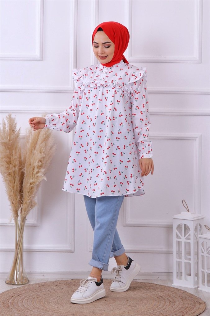 Uzun Kollu Beyaz Fırfırlı Kadın Tunik