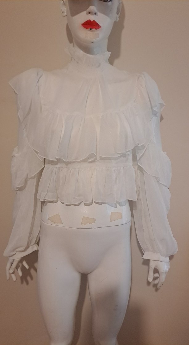 Yüksek yakalı, uzun kollu beyaz mini bluz, bol kesim ve fırfır detaylarıyla parti stiline uygundur. Sentetik kumaştan üretilmiştir.