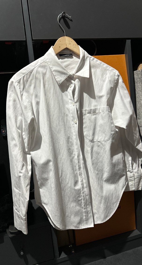Uzun kollu, bol düğmeli ön cep detaylı beyaz keten gömlek, rahat ve salaş kesimle günlük kullanıma uygun.