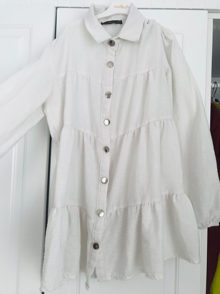 Beyaz gömlek tunik , yakalı, uzun kollu ve bol kesimdir. Düğmeli ön kısmı ve uzun boyuyla bohem tarzı sunar, günlük kullanıma uygundur.