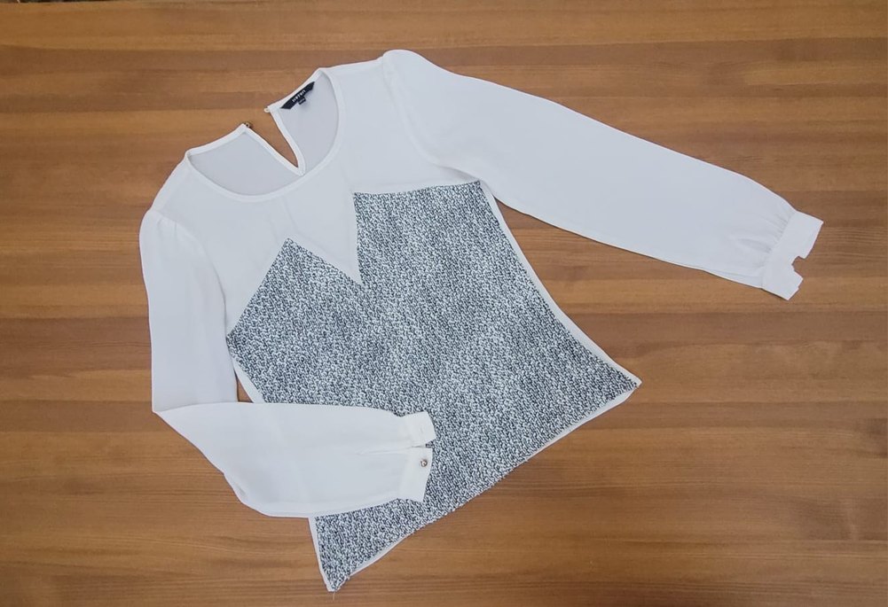 Kadın bluz, uzun kollu ve yuvarlak yaka, regular fit ve normal boyda. Beyaz zemin üzerine gri örme baskılı desenli, sentetik kumaştan. Günlük kullanıma uygun modern tarzda.
