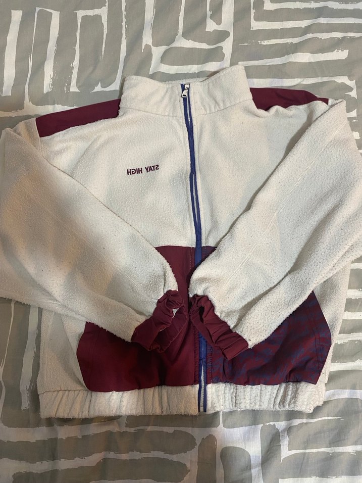 Yumuşak ve sıcak kumaştan, yüksek yakalı ve fermuarlı, bol kesim kadın ceketi. Beyaz ve bordo renklerde baskılı, günlük rahat sokak stili için uygundur. Üstünde stay high yazıyor, oversize kalıp.