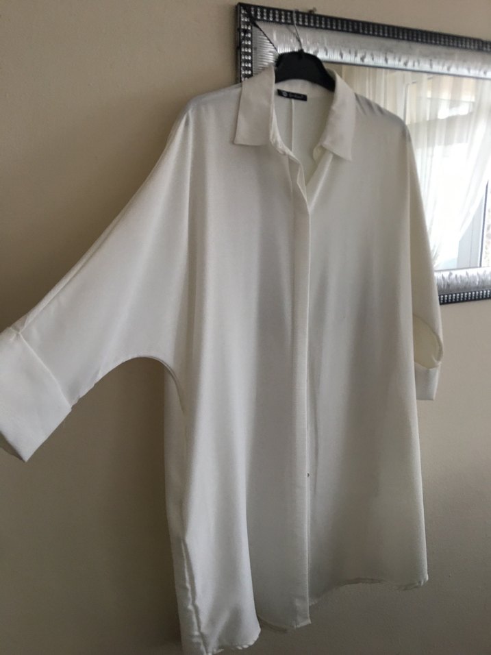 Uzun kollu, bol kesim beyaz kadın gömleği, yakalı ve düğmeli ön detaylıdır. İpeksi kumaştan üretilmiş, minimalist ve sade tarzda, günlük kullanıma uygundur.
