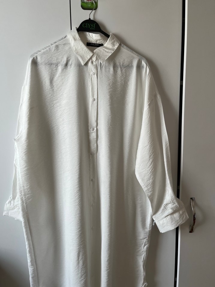 Krep kumaştan, düğmeli, yakalı ve uzun kollu, bol kesim beyaz kadın gömleği. Minimalist ve desensiz tasarımıyla günlük kullanıma uygundur.