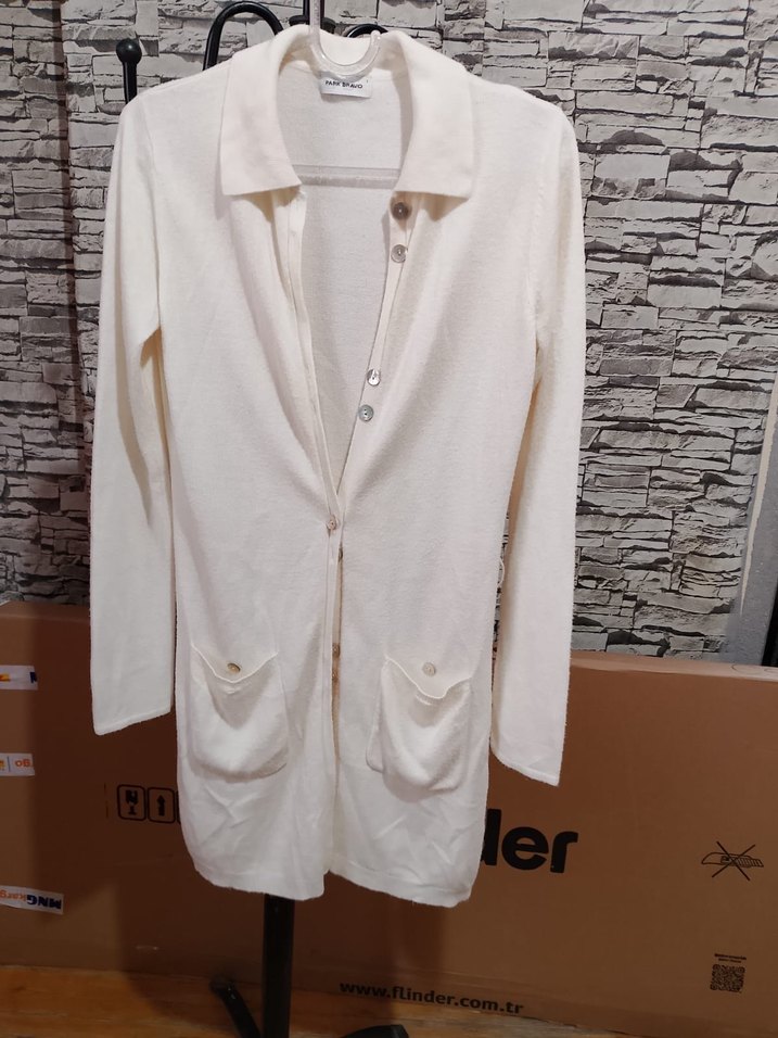 Pamuk kumaştan yapılmış, uzun kollu ve düğmeli beyaz kadın hırka. Notlu yaka ve iki ön cep bulunur, rahat kesimlidir. Sokak stiline uygun, sade tasarım.
