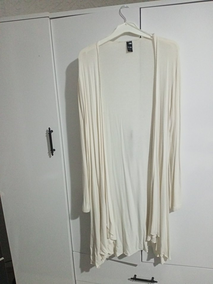 Beyaz keten kumaştan, uzun kollu ve salaş kesimli, drapeli kadın hırkası. Minimalist ve sokak stiline uygun, günlük kullanım için idealdir.