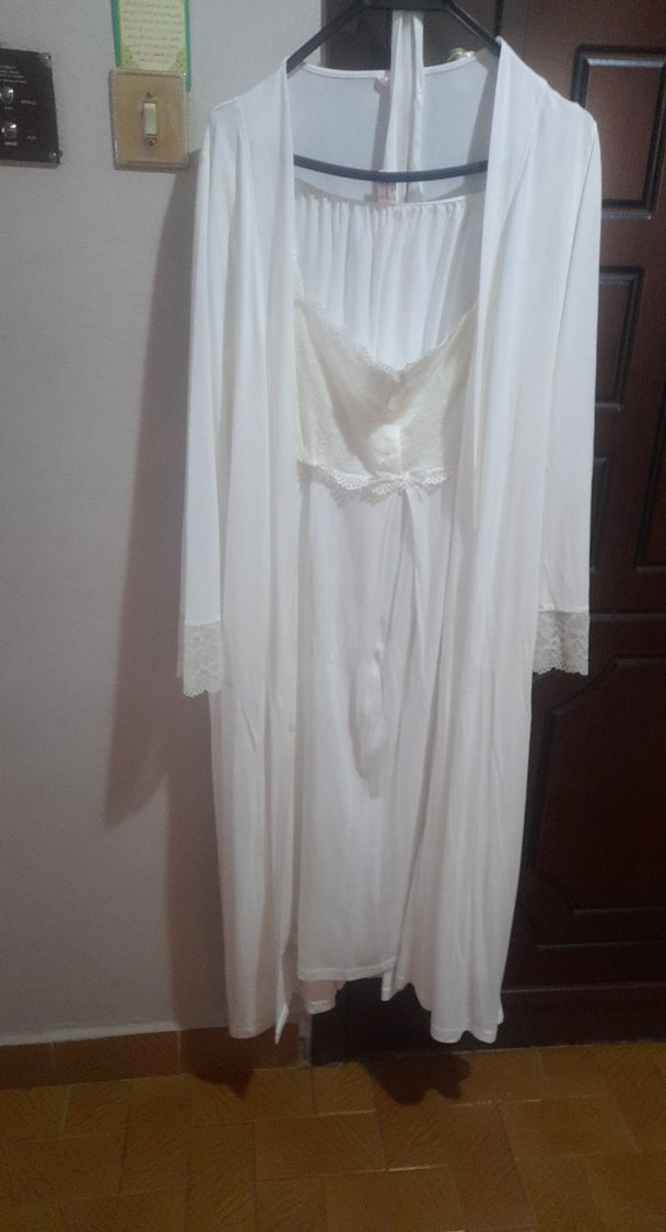 Uzun kollu, bol kesim ve yumuşak dokulu beyaz kadın sabahlık. İnce askılı iç katman ve zarif dantel detaylarıyla sade ve konforlu bir tasarım sunar.
