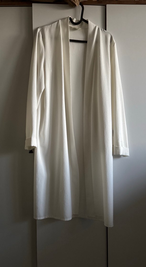 Uzun kollu, regular fit beyaz kadın tunik ceket, minimal ve desensiz tasarıma sahiptir. Hafif renkte, normcore tarzındadır.