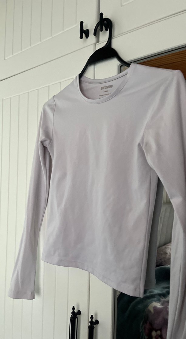 Pamuklu kumaştan, uzun kollu ve yuvarlak yakalı beyaz kadın tişörtü. Normal boyda ve sade, desen içermeyen yapısıyla günlük kullanım için uygundur.