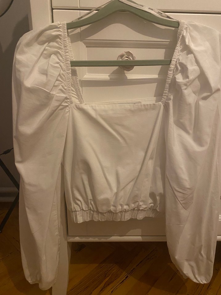 Beyaz keten bluz, kayık yaka ve uzun drapeli kollara sahiptir. Salaş kesimi ve midi boyu ile bohem tarz sunar. Alt kısmı lastiklidir.