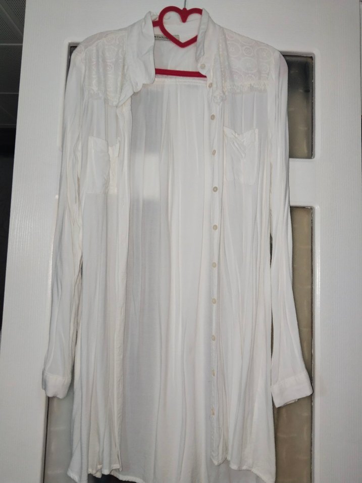 Beyaz keten gömlek, yakalı, uzun kollu ve düğmeli, bol kesimdir. Günlük kullanım için bohem tarzda tasarlanmıştır.