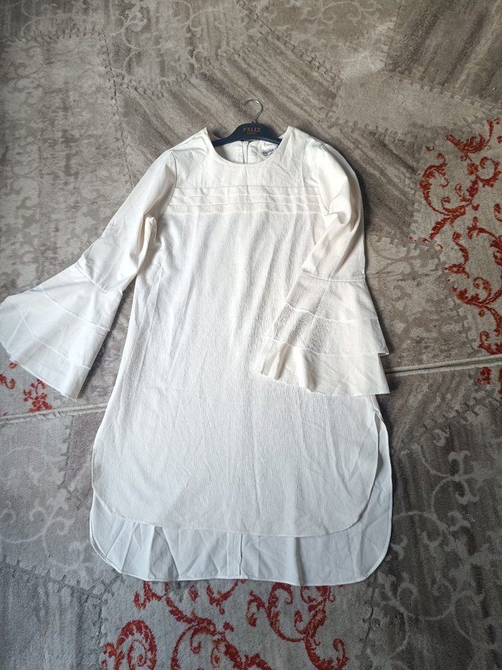 Uzun kollu, drapeli katmanlı manşetlere sahip, yuvarlak yakalı ve bol kesim beyaz keten tunik. Bohem ve retro tarzlar için uygun, günlük kullanıma ideal.