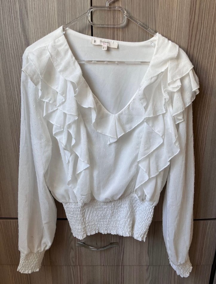 Uzun kollu, V yakalı beyaz keten bluz, kat kat fırfır detaylıdır. Bol kesim, lastikli bel ve manşetlere sahip kısa boyda, bohem tarzda bir üründür.