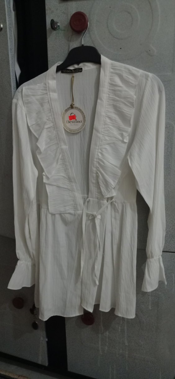 Uzun kollu, keten kumaştan beyaz kadın gömleği. Yakasında fırfır detay ve bağlamalı bel ile rahat ve hafif midi boyda tasarlanmıştır.
