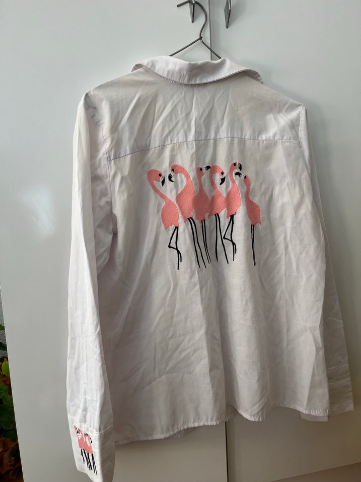 Bol kesim beyaz keten gömlek, uzun kollu ve yakalıdır. Sırtında ve manşetinde pastel flamingo baskısı bulunur. Bohem ve retro tarzları birleştirir. Günlük sokak giyimi için uygun.