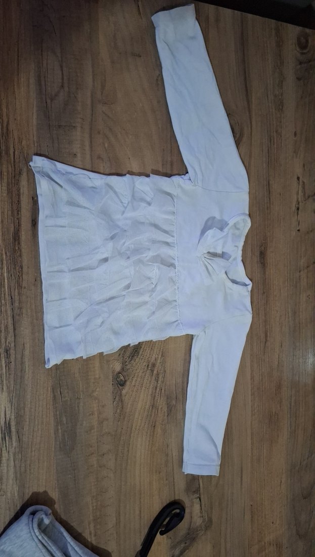 Bu kız gömleği keten kumaştan, uzun kollu ve V yakalıdır. Salaş kesim ve fırfır detaylara sahiptir, sade beyaz renktedir. bitek fiyonk kısmında sökük var o da dikilebilir