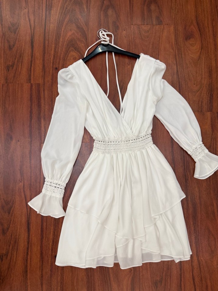 V yaka, uzun kollu ve volanlı manşetlere sahip beyaz bohem elbise, hafif sentetik kumaştan, bol kesimli ve katmanlı volanlıdır. Tam bir yaz modelidir