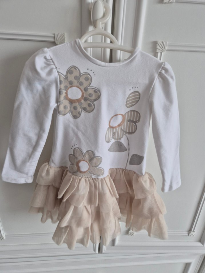 Uzun kollu, beyaz kız çocuk elbisesi, pastel çiçek desenli ve bol kesimdir. Etek kısmında fırfırlar ve bisiklet yaka bulunur, bohem tarzıyla şık bir görünüm sunar. Kolunda lekesi vardır, resimlerde bulunuyor.