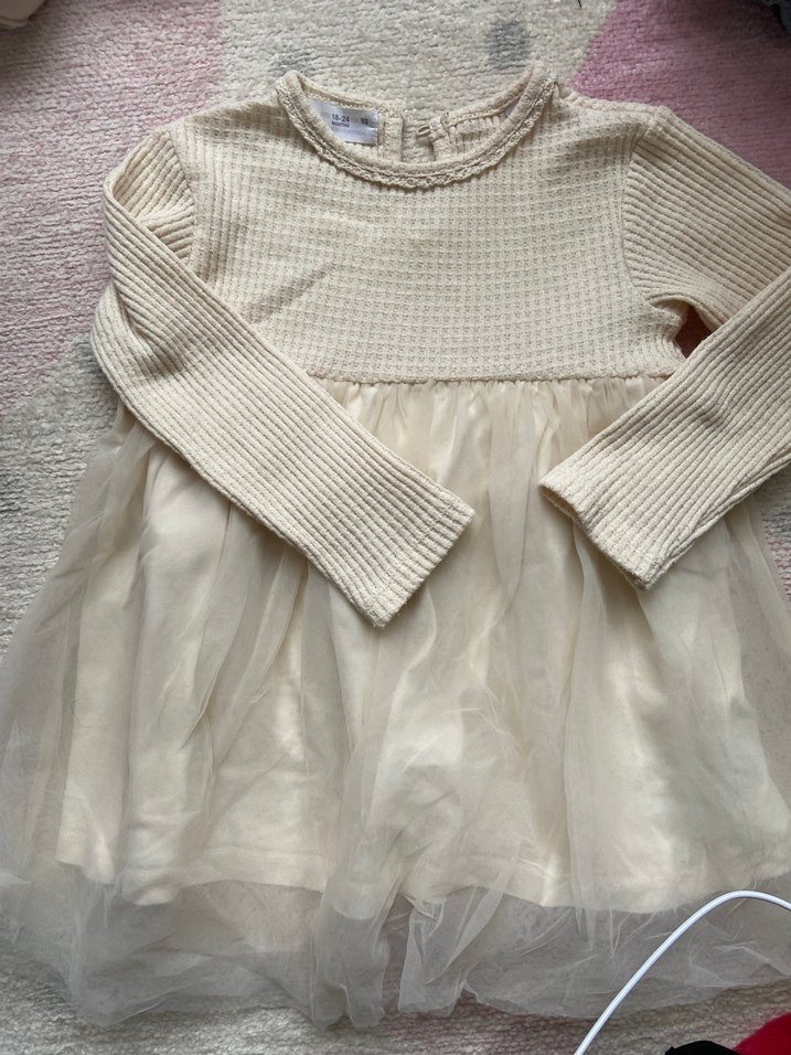 Bu kız çocuk elbisesi, triko uzun kollu üst kısmı ve krem rengi tül etek kısmıyla sade ve klasik bir görünüme sahiptir.