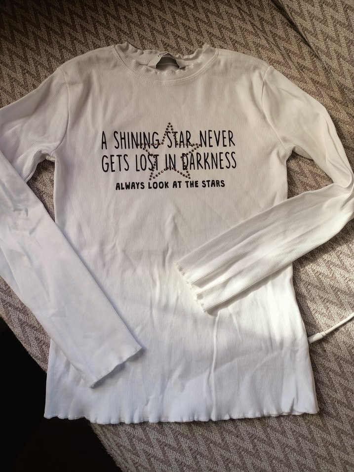 Yumuşak keten kumaştan yapılmış, uzun kollu ve bisiklet yaka, baskılı yazılı kız tişörtü. Sokak stiline uygun, rahat ve şık bir parça. ✨