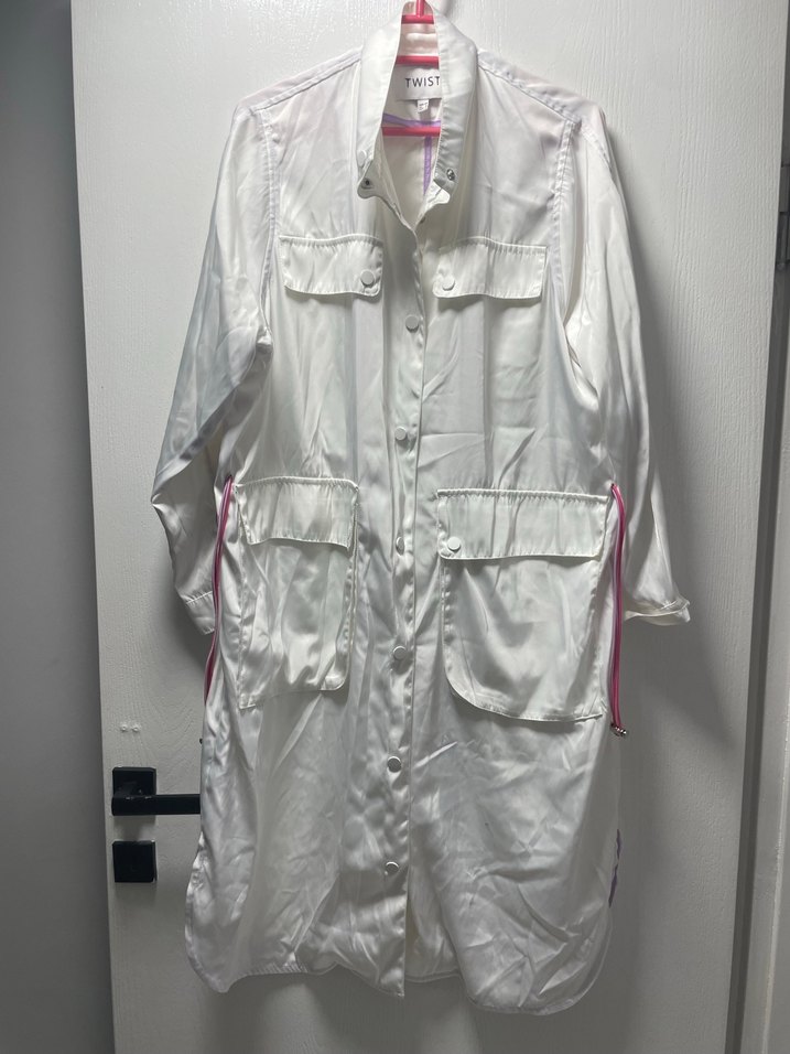 Bu beyaz uzun kollu midi kap, çıtçıtlı ve kesik yaka detaylıdır. Rahat kesimi ve ön cepleriyle sokak modasına uygun, sentetik dokulu kumaştan üretilmiştir.