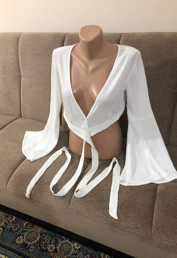 Beyaz, uzun kollu, drapeli ve halter yakalı mini, vücuda oturan bluz. Rahat bohem stil, düğünler için uygundur.