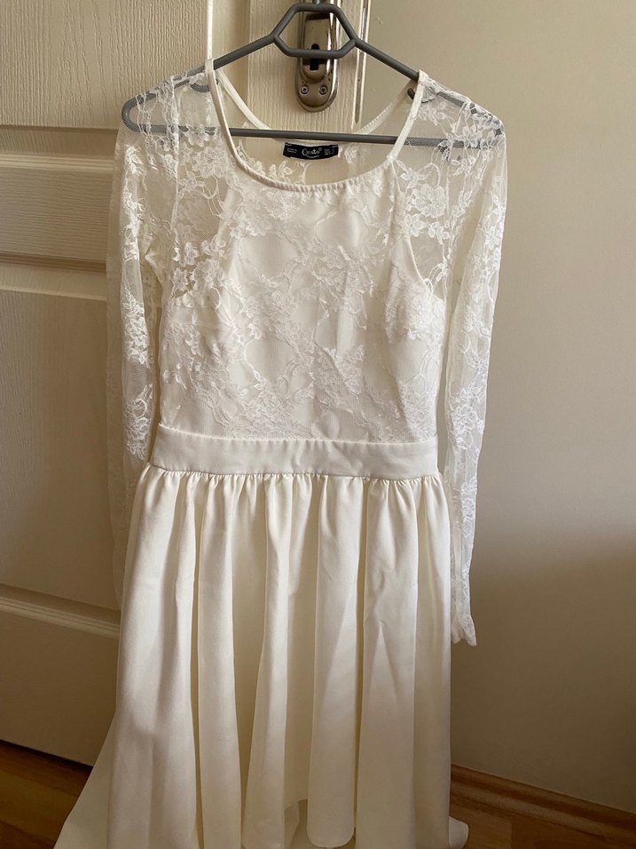 Uzun dantelli kollara, straplez yakaya ve bol kesime sahip beyaz mini gelinlik, modern klasik.