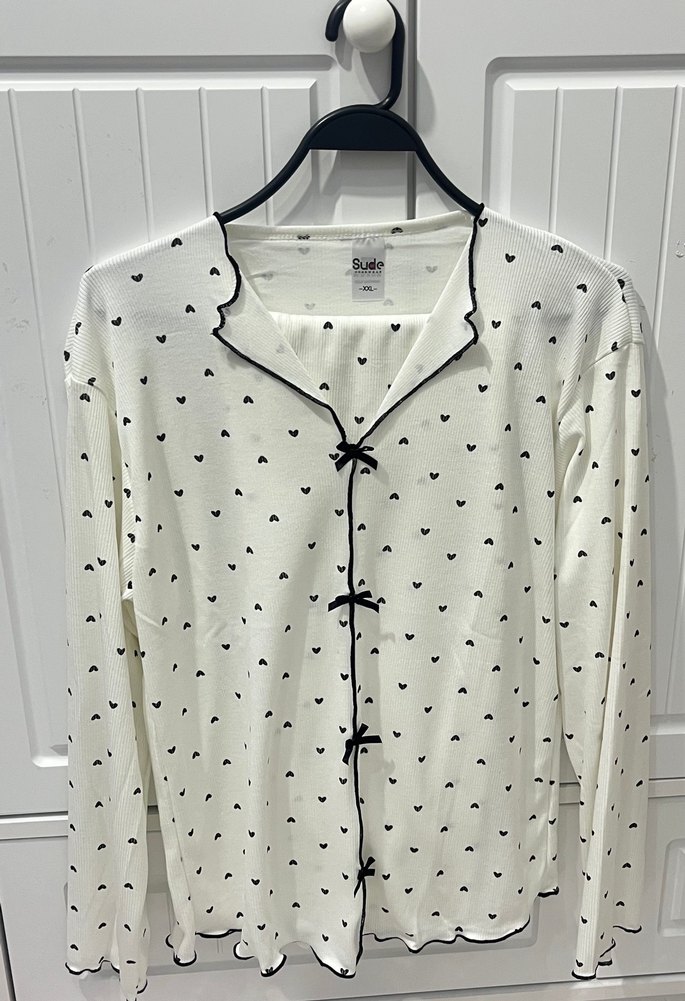 Uzun kollu, bol kesim ve kısa boyda kadın pijama üstü. Beyaz zemin üzerine kırmızı kalp desenleri ve kırmızı detaylar bulunur. Rahat ve sokak stili uyumlu. ❤️