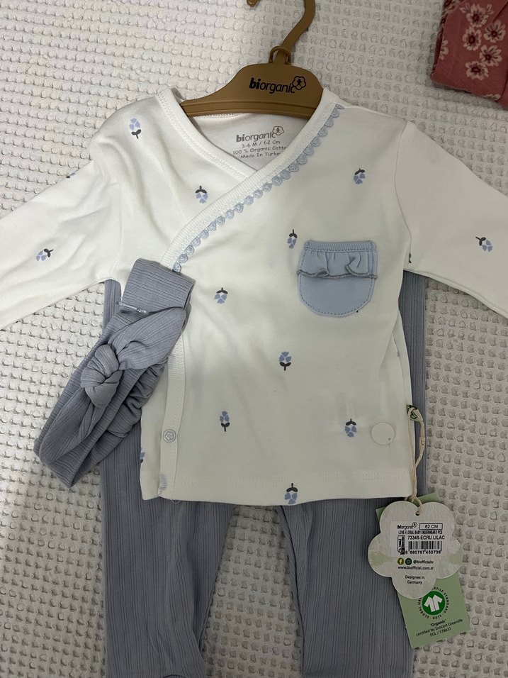 Pamuklu, uzun kollu, düğmeli ve nakışlı beyaz bebek hastane kıyafeti. Gri pantolon ve uyumlu saç bandı içerir. Rahat ve sade tasarım, Biorganic markası. 3/6 ay kız bebek