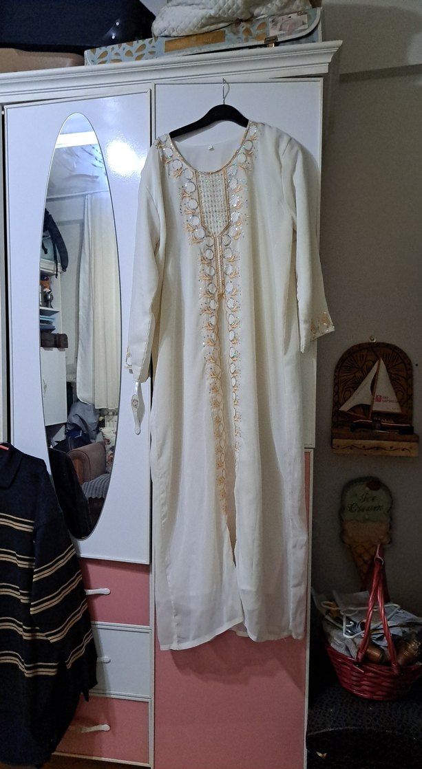 Uzun kollu, V yaka beyaz bohem elbise, işlemeli detaylarla ve drapeli ipeksi kumaşla tasarlanmıştır. Düğünler için uygundur.