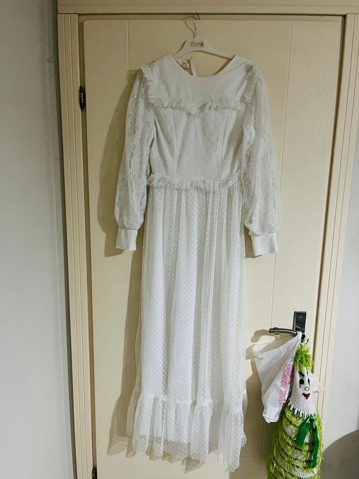 Nakışlı desenler, fırfırlar ve yüksek yakası olan uzun beyaz elbise. Yumuşak keten kumaştan, uzun kollu ve bol kesim. Vintage bohem tarzını yansıtır.