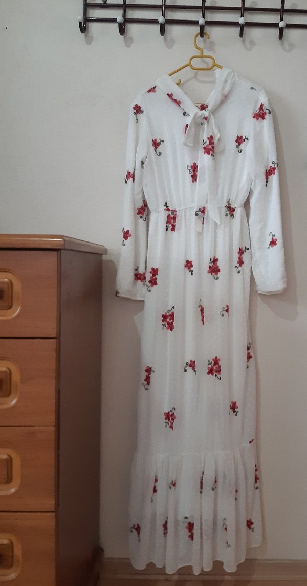 Uzun Kollu Beyaz Nakışlı Bohem Elbise