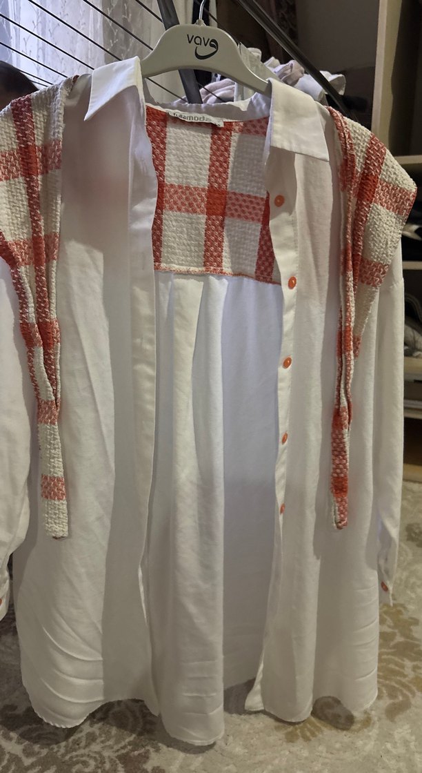 Uzun kollu, yakalı beyaz gömlek, nakış detaylı ve düğmeli. Midi boyda, bohem tarzda, günlük kullanıma uygun rahat kesim.