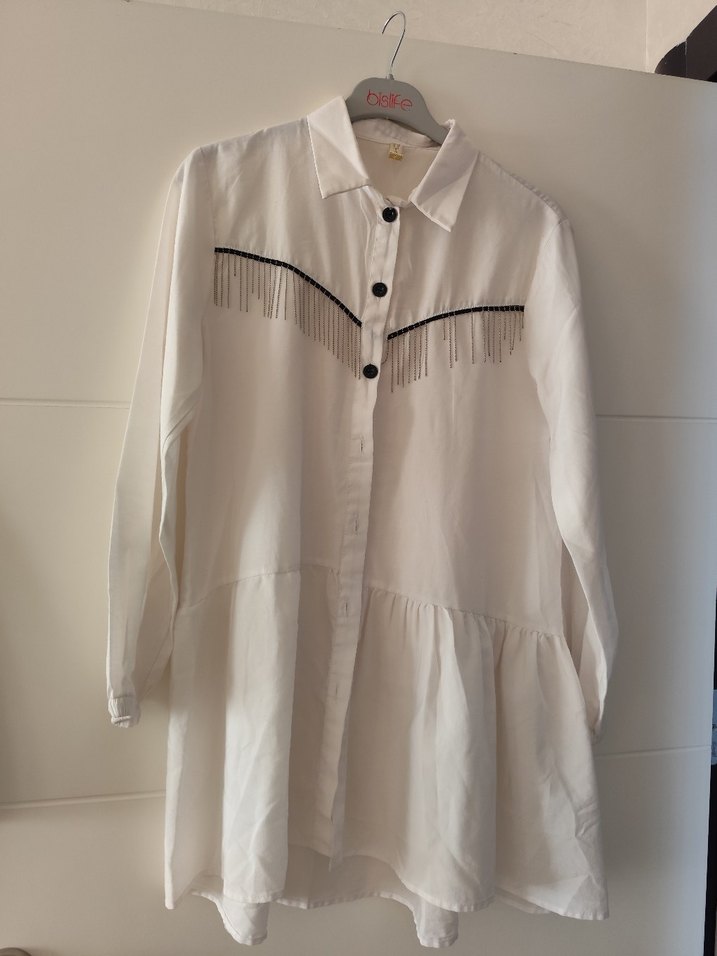 Uzun boylu beyaz keten gömlek, yakalı ve düğmeli ön kısmıyla dikkat çeker. Uzun kollu ve bol kesimdir, göğüs kısmında siyah nakış detayları bulunmaktadır. Günlük kullanıma uygundur.