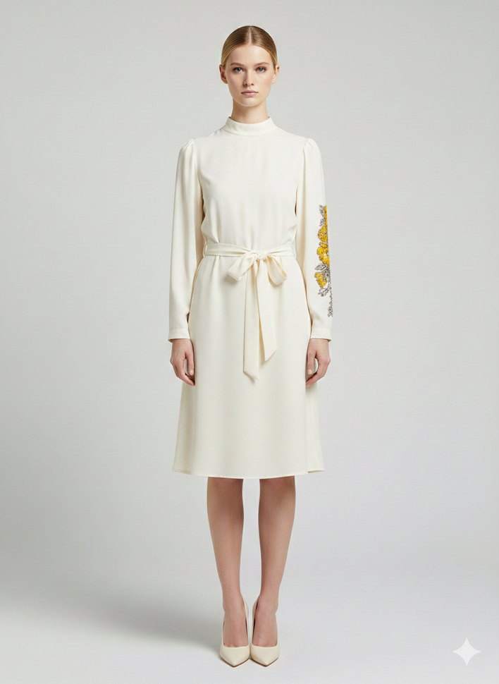 Uzun Kollu Beyaz Nakışlı Kadın Elbise