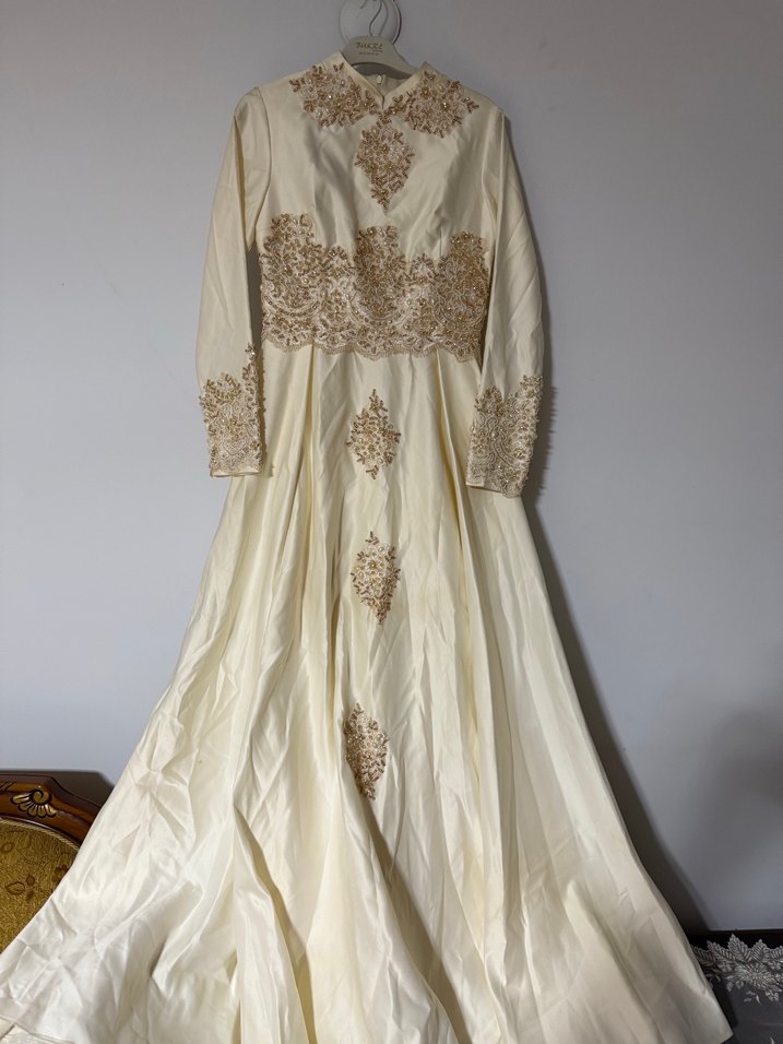 Uzun kollu, tekne yaka, beyaz parlak kumaştan yapılmış, nakışlı ve drapeli klasik vintage gelinlik. Vücuda oturan kesimiyle şık bir seçim.