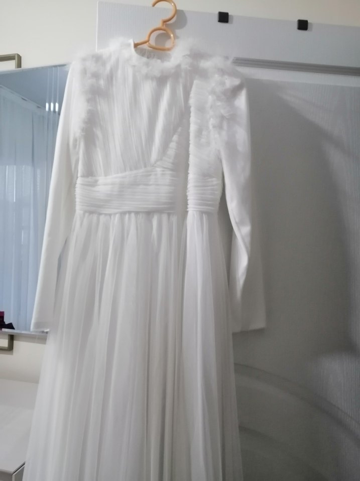 Uzun kollu, tekne yaka, minimalist tasarımlı beyaz A kesim gelinlik, modern klasik görünüm için ideal. Nikah günümde giydim, temiz durumda bi sorunu yok nikah için alınabilir şık