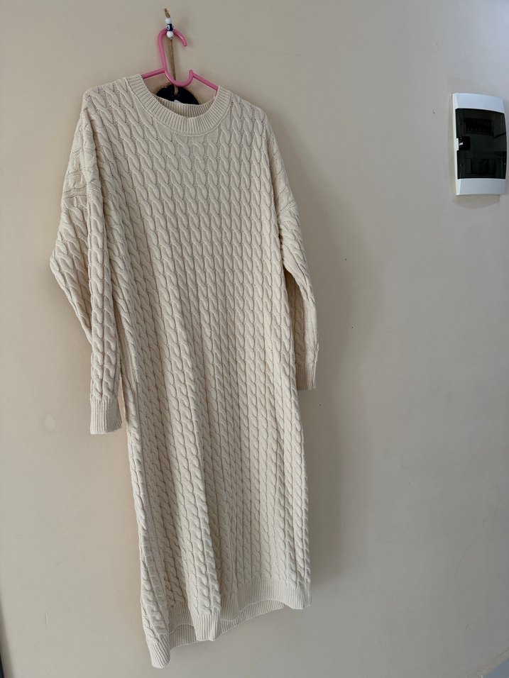 Uzun kollu, beyaz örgü kadın kazak. Bol kesim ve yuvarlak yaka ile rahat ve sade bir görünüm sunar. Yumuşak örme kumaştan üretilmiştir.